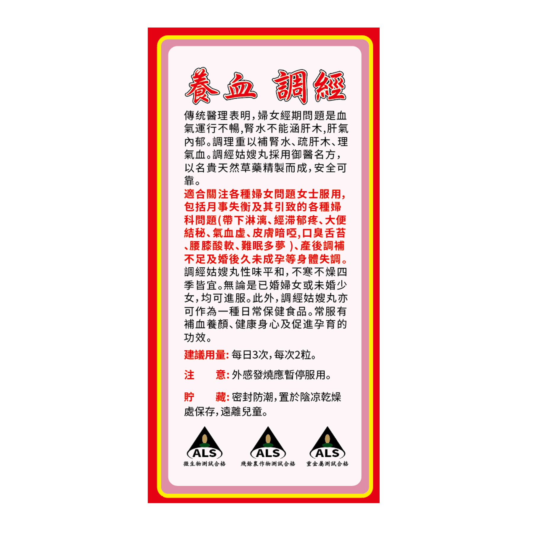 -調經姑嫂丸性味平和,不寒不燥四季皆宜。無論是已婚婦女或未婚少女,均可進服。此外,調經姑嫂丸亦可作為一種日常保健食品。常服有補血養顏、健康身心及促進孕育的功效。